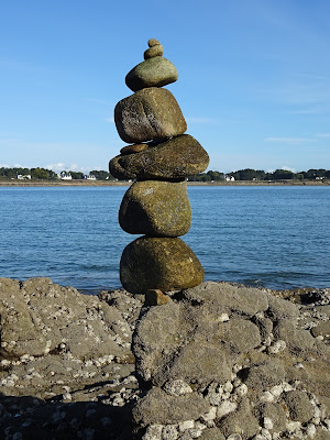 Je suis emporté par le mouvement de l'existence humaine. Jours de disette où j'accomplis, malgré tout, mon destin. Les vagues frappent la côte de Kerpenhir, en cadence, drues, têtues, avec force. Je sens vibrer la roche sous mes pieds.Face au vent,je rejoins la vie qui se love dans ces petits instant de temps long. Je ne céderai ma place pour rien. Fabriquer des cairns, ici, est une belle gageure, mais les réussir, une grande joie. Il ne s'agit pas, ici, de chercher l'original, ou la flatterie vile mais l'épaisseur et la profondeur de ma vie qui me branche avec la nature.